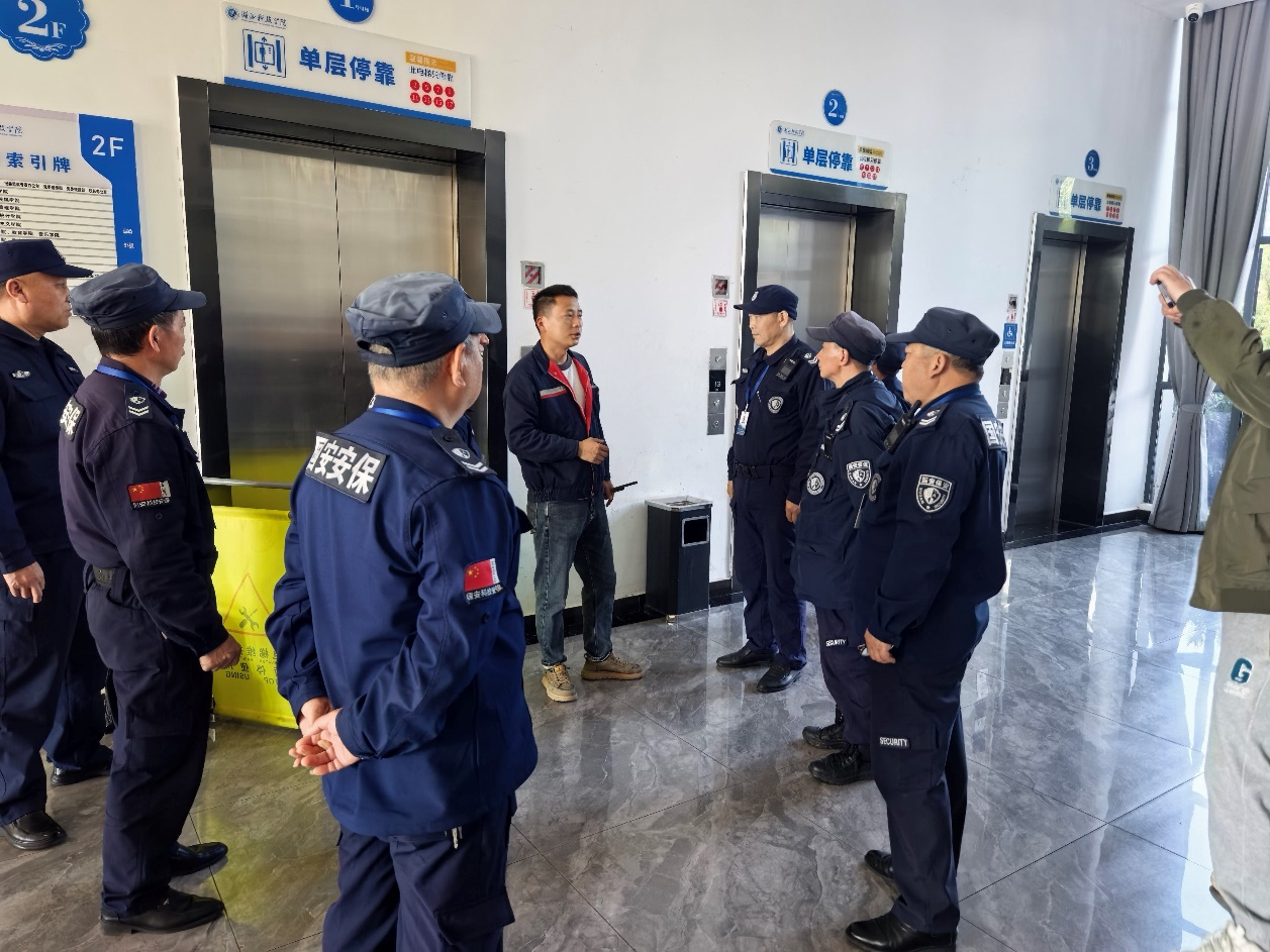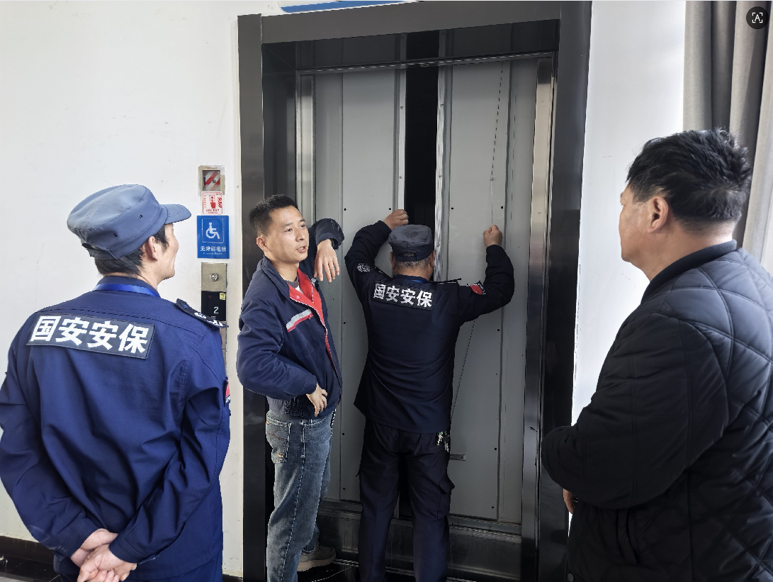 理论讲解和示范结束后,模拟应急救援环节正式启动。演练模拟场景设定为:揽胜楼2号电梯因突发故障,多名人员被困轿厢内,被困人员第一时间通过电梯内紧急呼叫按钮、救援电话求助。接到求助电话后,2名值班保安迅速响应,携带救援工具赶赴现场,按照预案流程,首先在电梯口设置安全警示标志,划定警戒区域,防止无关人员靠近引发二次危险。随后,一人负责现场秩序维护,提醒过往师生远离演练区域;另一人则通过对讲系统与被困人员保持持续沟通,耐心安抚其紧张情绪,告知救援进展,缓解其焦虑心理,同时精准判断电梯轿厢位置,严格按照工程师讲解的规范流程,成功打开电梯门,安全解救所有被困人员,并对被困人员进行简单身体检查和情绪安抚。